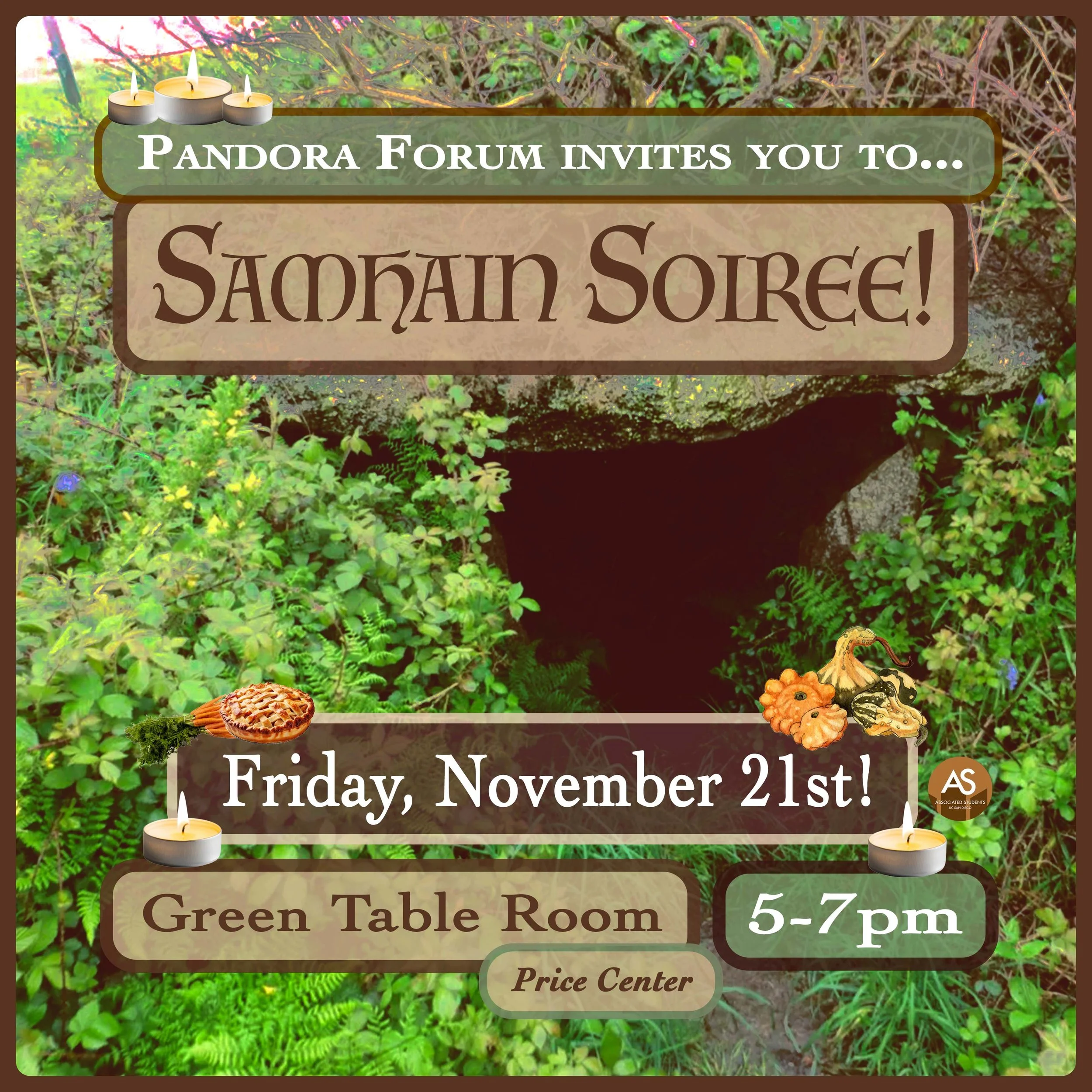 We invite you to… Samhain Soiree!! Join us in the Green Table Room in Price Center on Friday, November 21st! We will be decorating tea lights and masks, performing rituals, and warding off evil! Hope to see you at our first event of the year!