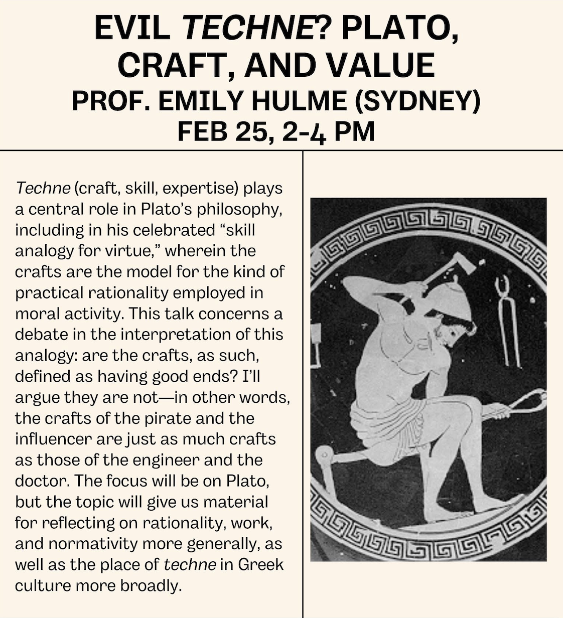 Back to All Events Evil Techne? Plato, Craft, and Value Wednesday 25 February 2026 14:00 16:00 Google Calendar ICS